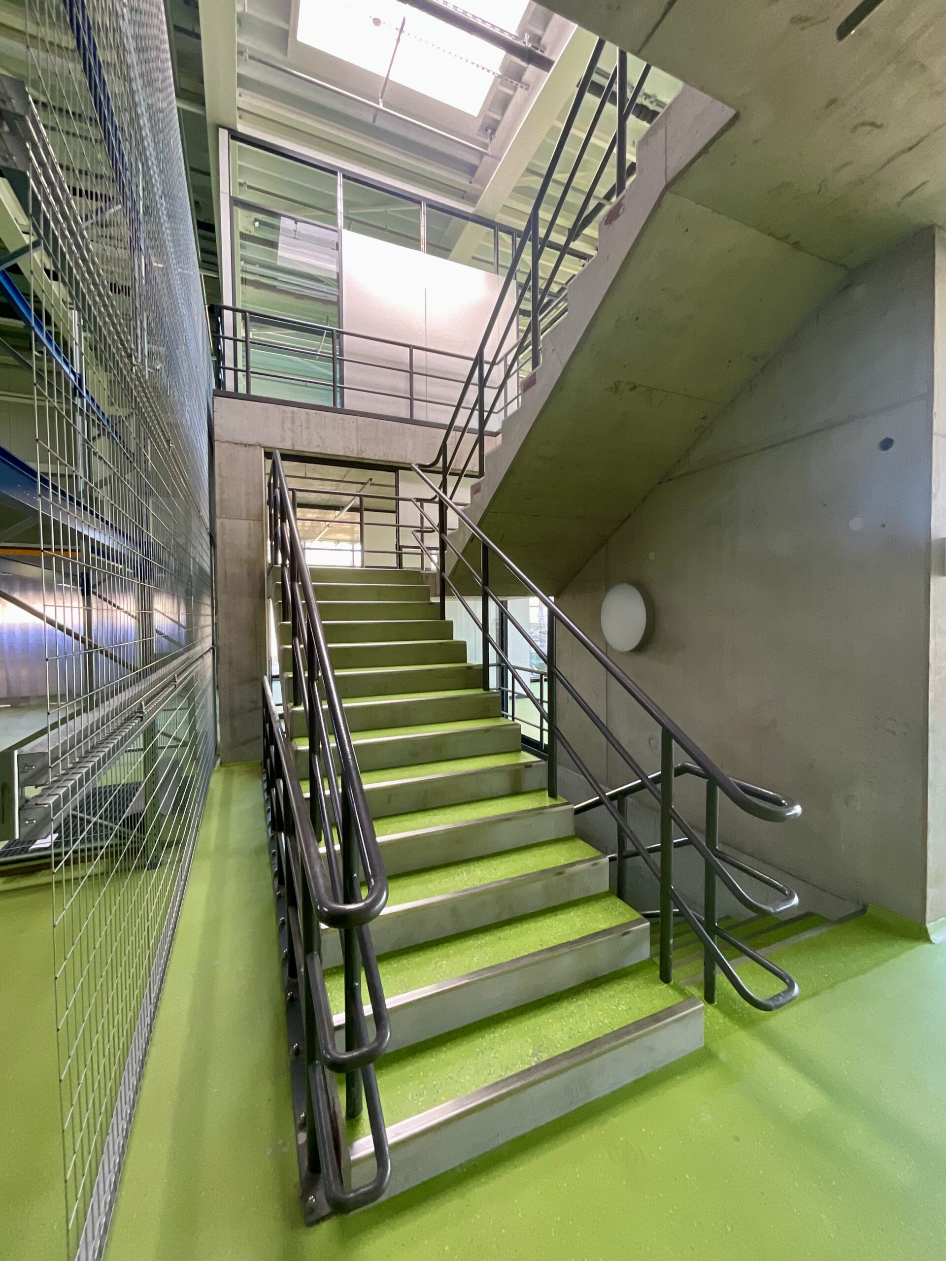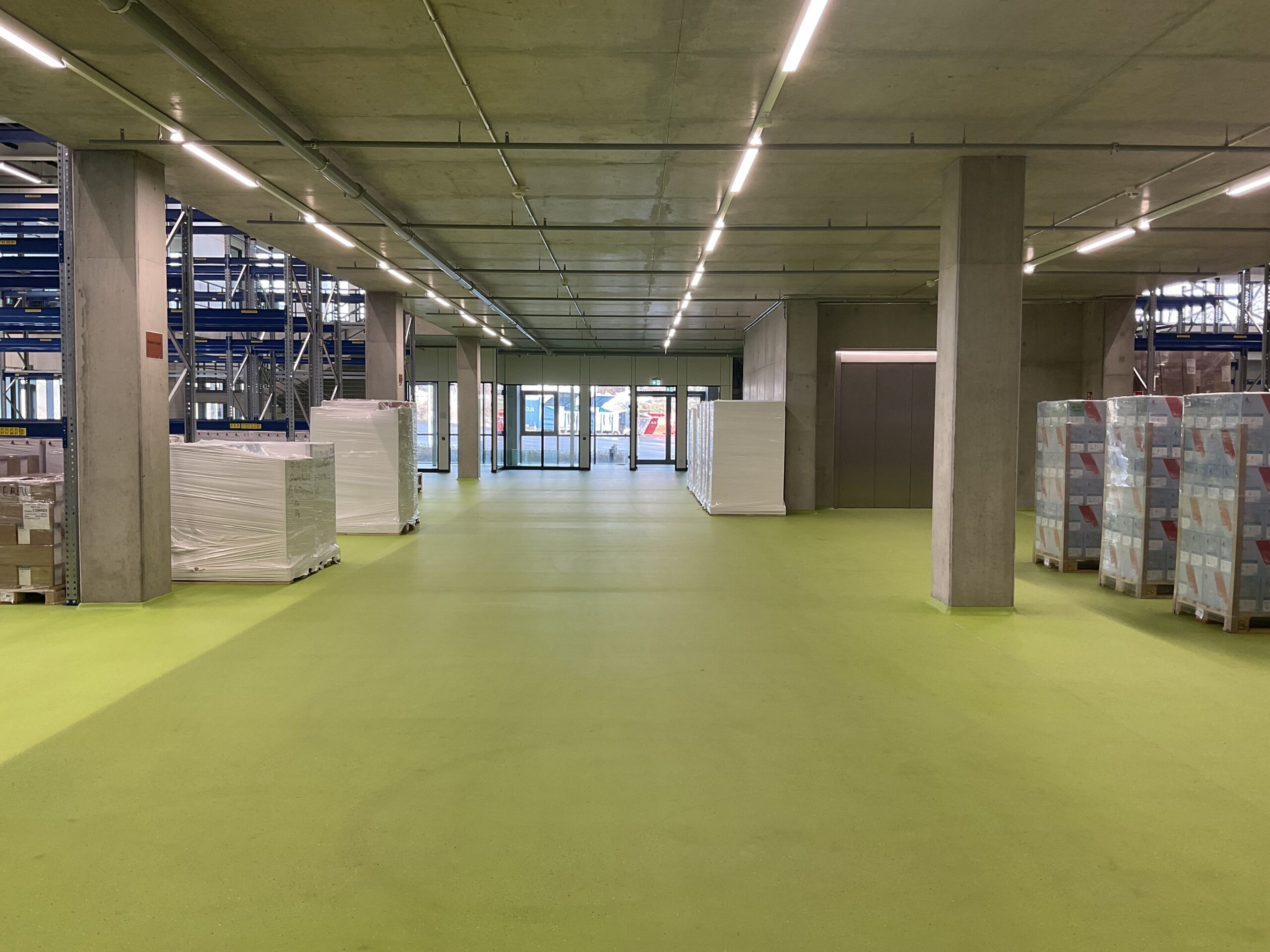 High-bay storage above an underground level. Extraordinary 8,75m span and 2t/sqm. Super-wide-wing roof with integrated supply media. -